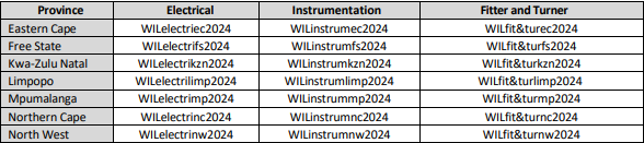 NB!!! The following table consists of the (WIL) Electrical, Instrumentation and Fitter and Turner